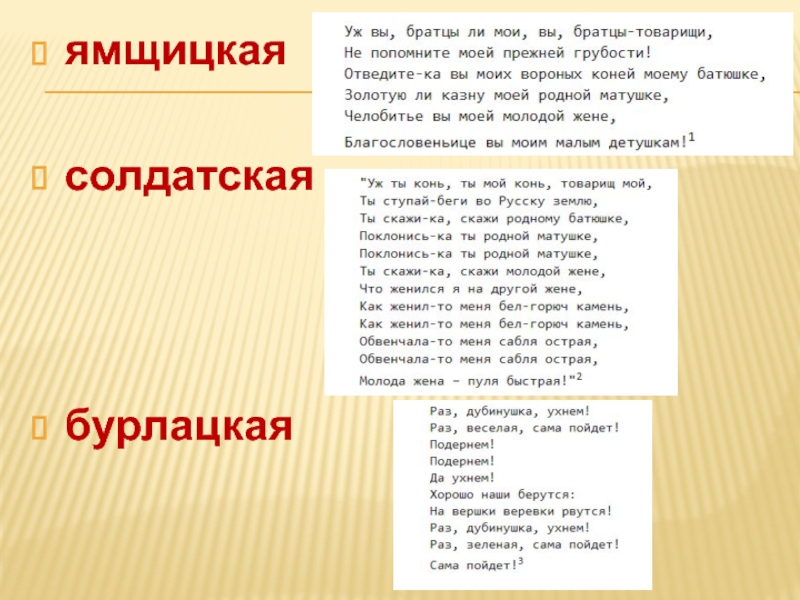 Бурлацкие, рекрутские, солдатские, ямщицкие по своему содержанию, как
