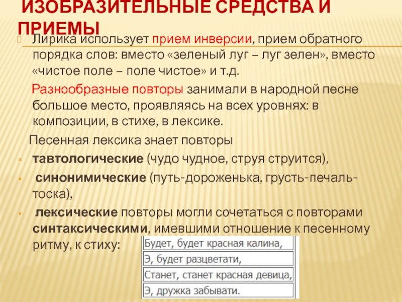 Разнообразные повторы занимали в народной песне большое место, проявляясь на всех уровнях: в композиции, в стихе, в лексике.