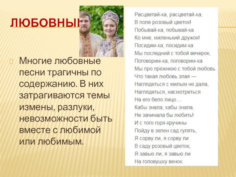 Многие любовные песни трагичны по содержанию. В них затрагиваются темы измены,