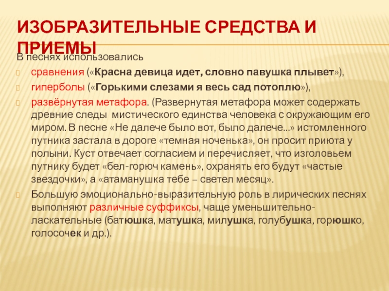 развёрнутая метафора. (Развернутая метафора может содержать древние следы мистического единства человека с окружающим его миром. В песне «Не далече было вот, было далече...» истомленного путника застала в дороге «темная ноченька», он просит приюта у полыни. Куст отвечает согласием и перечисляет, что изголовьем путнику будет «бел-горюч камень», охранять его будут «частые звездочки», а «атаманушка тебе – светел месяц».
