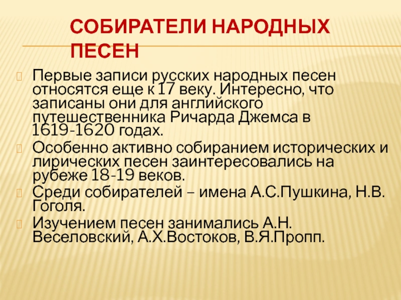Изучением песен занимались А.Н.Веселовский, А.Х.Востоков, В.Я.Пропп.