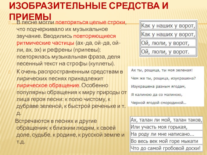 их музыкальное звучание. Вводились повторяющиеся ритмические частицы (ах-да, ой-да, ой-ли, ах, эх) и рефрены (припевы); повторялась музыкальная фраза, деля песенный текст на строфы (куплеты).