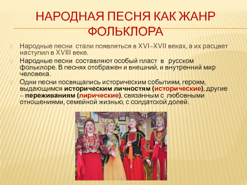 Народные песни стали появляться в XVI–XVII веках, а их расцвет