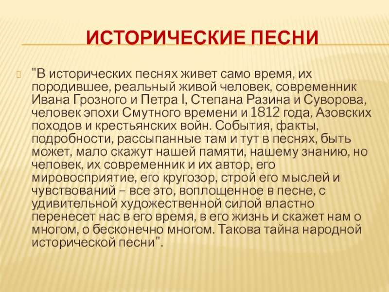 человек, современник Ивана Грозного и Петра I, Степана Разина и Суворова, человек эпохи Смутного времени и 1812 года, Азовских походов и крестьянских войн. События, факты, подробности, рассыпанные там и тут в песнях, быть может, мало скажут нашей памяти, нашему знанию, но человек, их современник и их автор, его мировосприятие, его кругозор, строй его мыслей и чувствований – все это, воплощенное в песне, с удивительной художественной силой властно перенесет нас в его время, в его жизнь и скажет нам о многом, о бесконечно многом. Такова тайна народной исторической песни".
