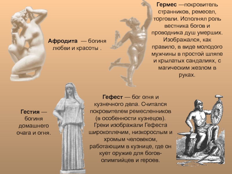 Гефест — бог огня и кузнечного дела. Считался покровителем ремесленников (в особенности кузнецов). Греки изображали Гефеста широкоплечим, низкорослым и хромым человеком, работающим в кузнице, где он кует оружие для богов-олимпийцев и героев.
