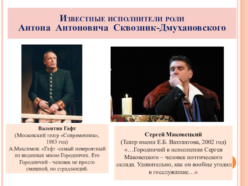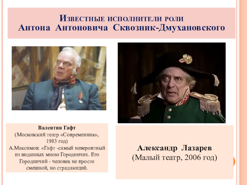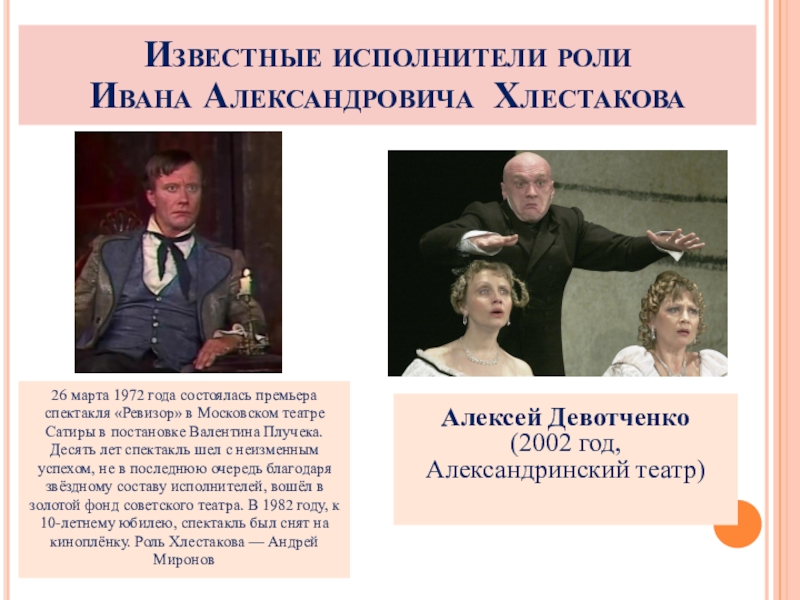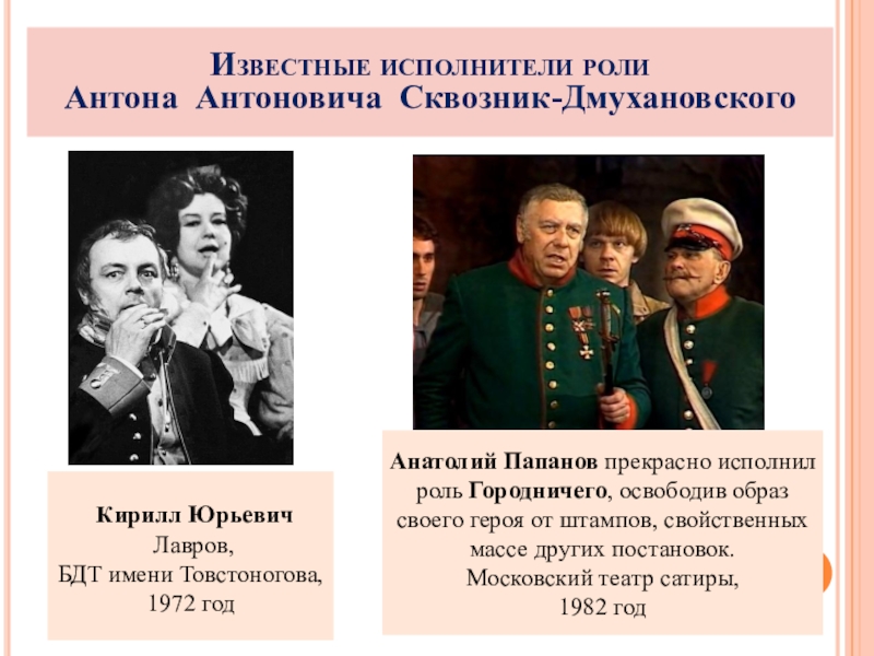 Анатолий Папанов прекрасно исполнил роль Городничего, освободив образ своего героя от штампов, свойственных массе других постановок.