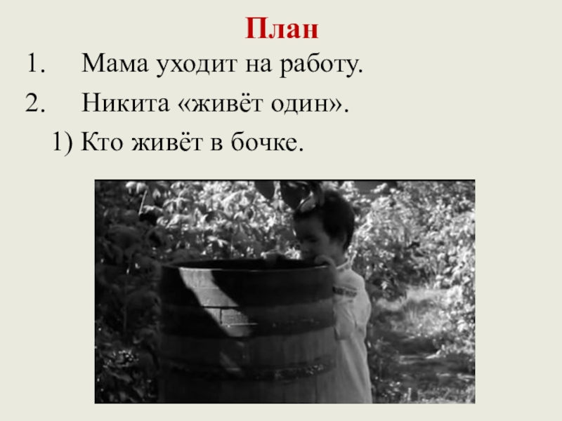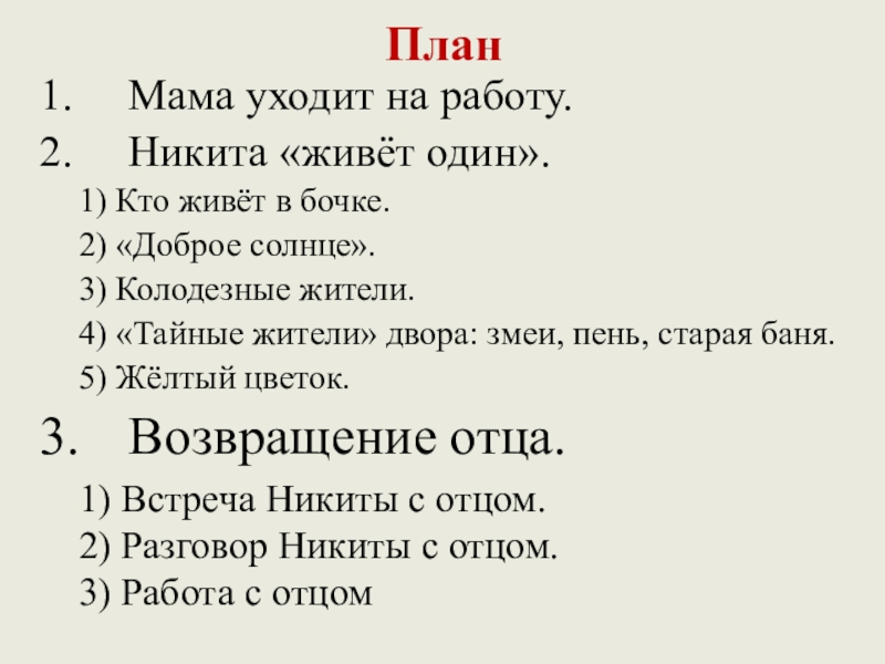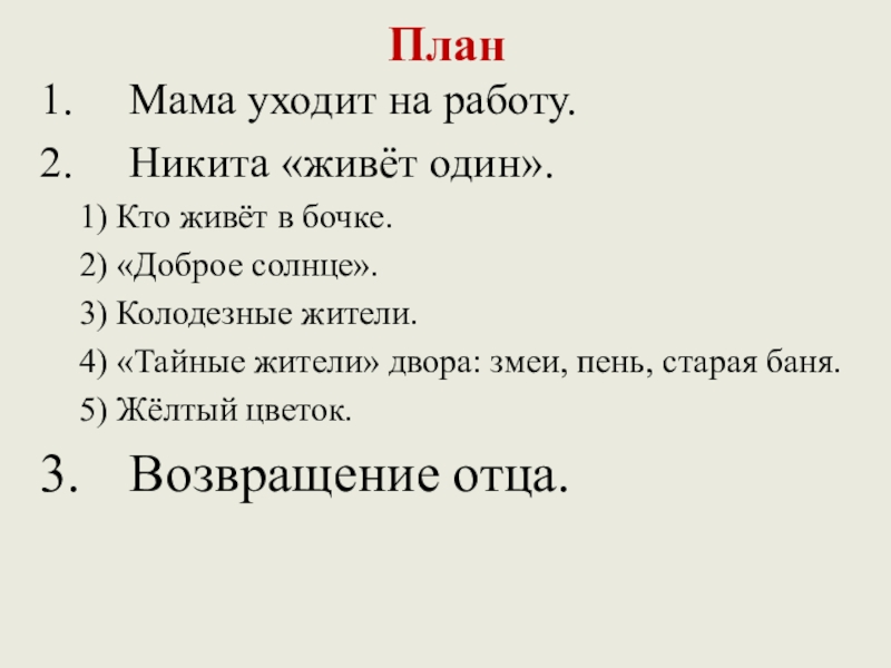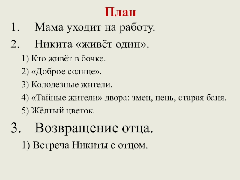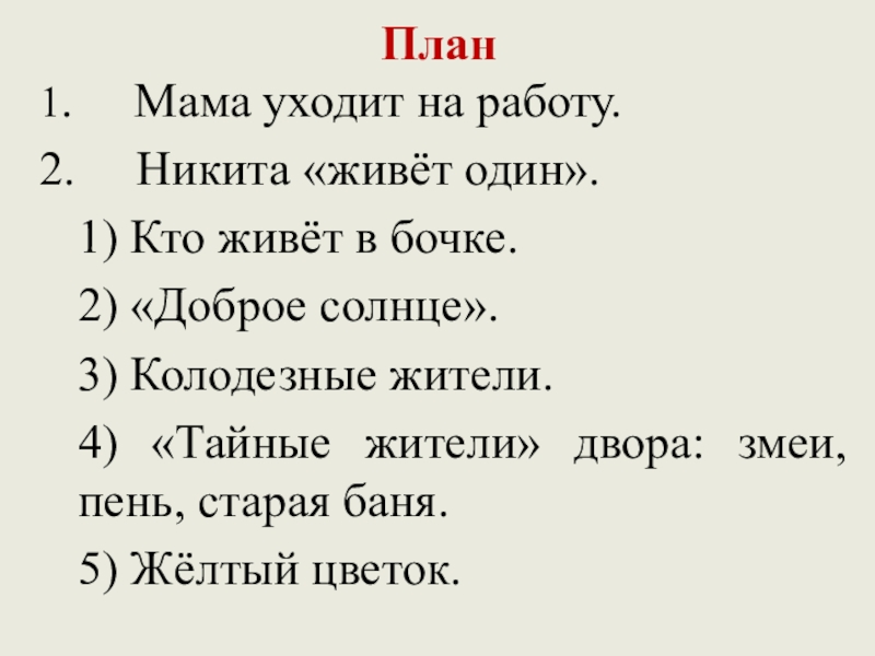 План 1.     Мама уходит на работу.2.     Никита «живёт один».1) Кто живёт в бочке.2) «Доброе солнце».3) Колодезные жители.4) «Тайные жители»