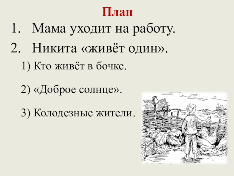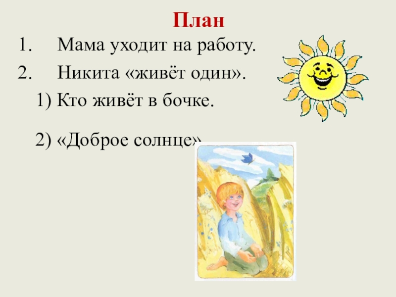 План 1.   Мама уходит на работу.2.   Никита «живёт один».1) Кто живёт в бочке.2) «Доброе солнце».3) Колодезные жители.