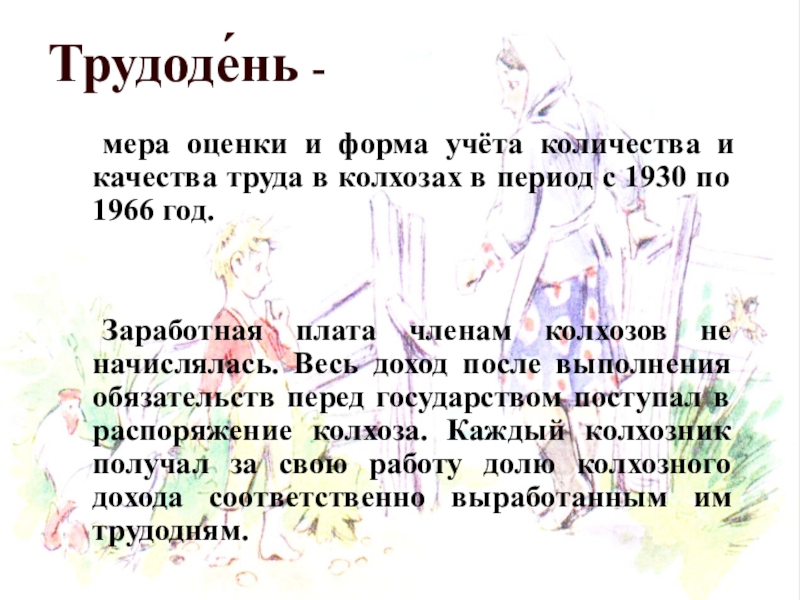 Трудоде́нь - 	мера оценки и форма учёта количества и качества труда в колхозах в период с 1930 по
