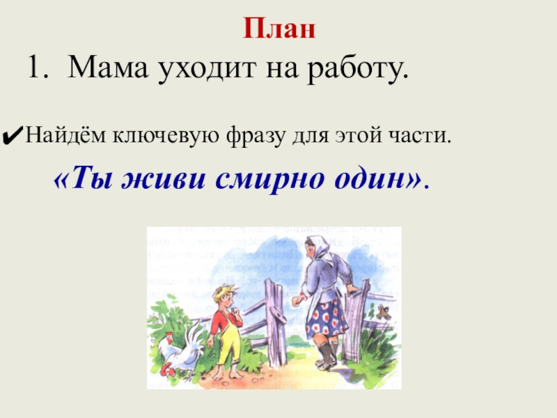 План 1.  Мама уходит на работу.Найдём ключевую фразу для этой части. 	«Ты живи смирно один».