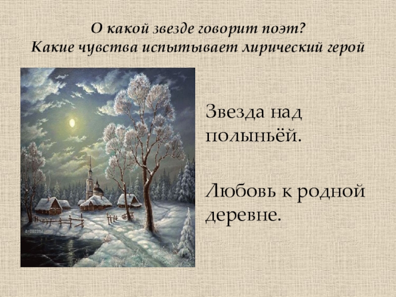 О какой звезде говорит поэт? Какие чувства испытывает лирический геройЗвезда над полыньёй.Любовь к родной деревне.