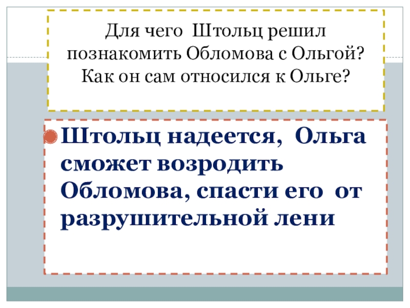 Штольц надеется, Ольга сможет возродить Обломова, спасти его от разрушительной лени