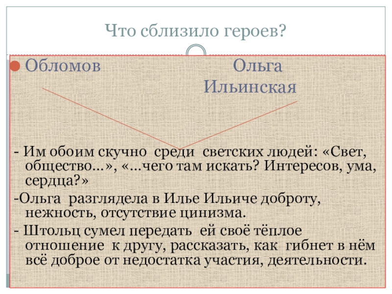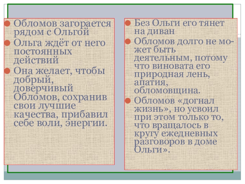 Обломов «догнал жизнь», но усвоил при этом только то, что вращалось в кругу ежедневных разговоров в доме Ольги».