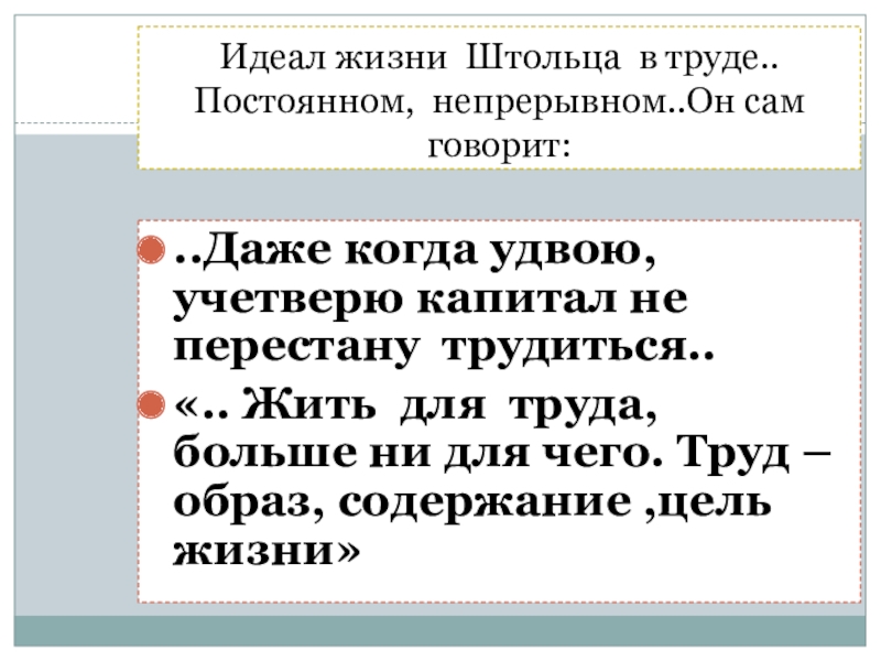 Слайд 6Идеал жизни Штольца в труде.. Постоянном, непрерывном..Он сам говорит: