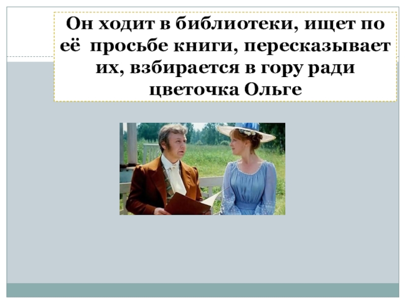 Слайд 33Он ходит в библиотеки, ищет по её просьбе книги, пересказывает их,