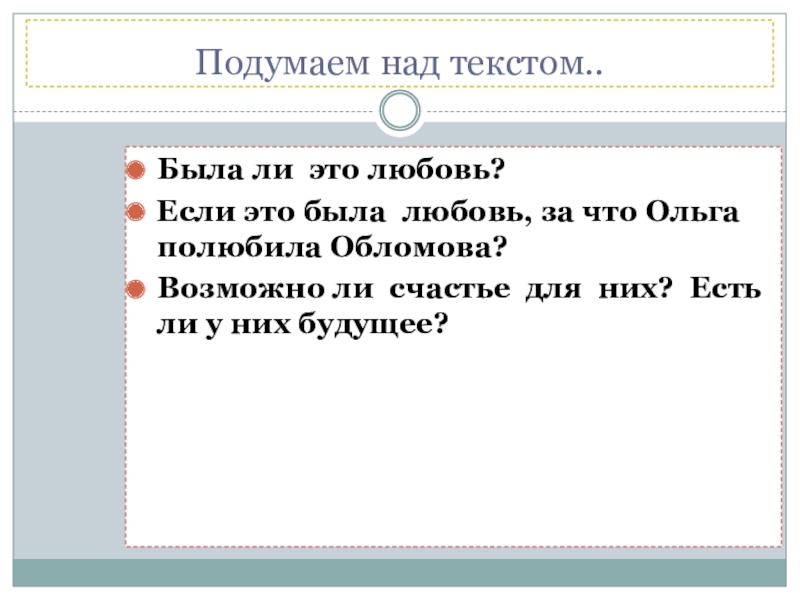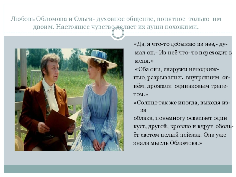Слайд 28Любовь Обломова и Ольги- духовное общение, понятное только им двоим. Настоящее