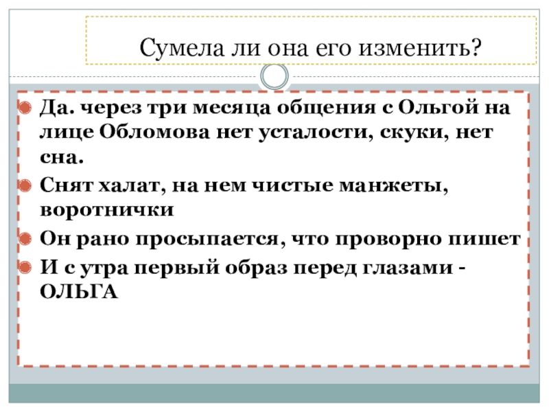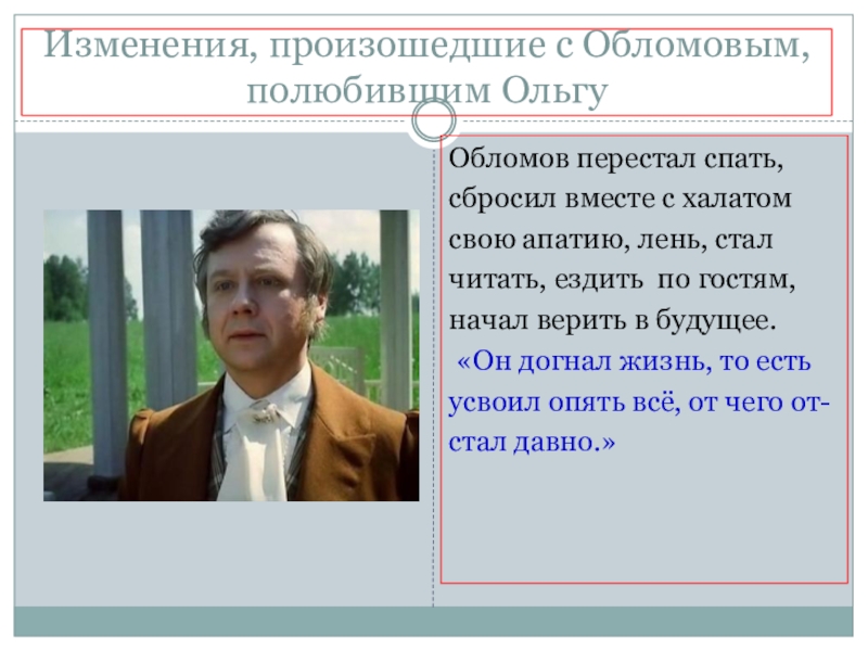 Слайд 29Изменения, произошедшие с Обломовым, полюбившим Ольгу