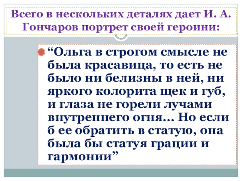 Слайд 18Всего в нескольких деталях дает И. А. Гончаров портрет своей героини: