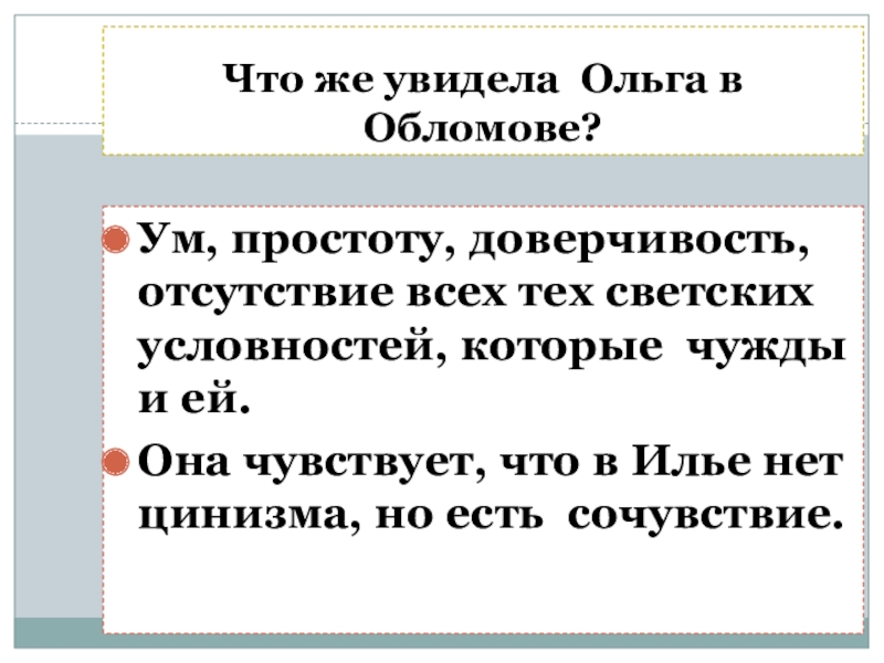 -Ольга разглядела в Илье Ильиче доброту, нежность, отсутствие цинизма.