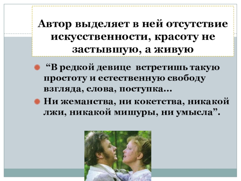 Слайд 20Автор выделяет в ней отсутствие искусственности, красоту не застывшую, а живую