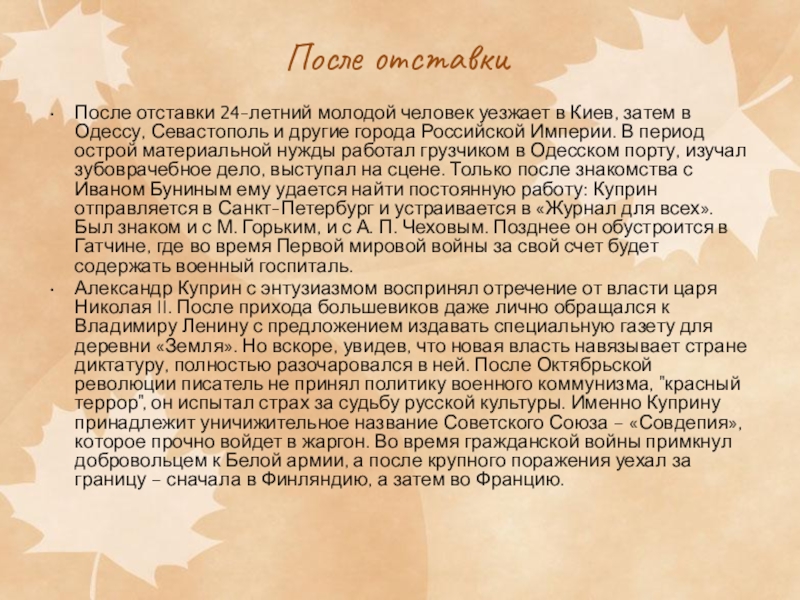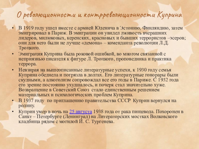 Эмиграция Куприна была роковой ошибкой, во многом связанной с неприязнью писателя к фигуре Л. Троцкого, проповедника и практика террора.