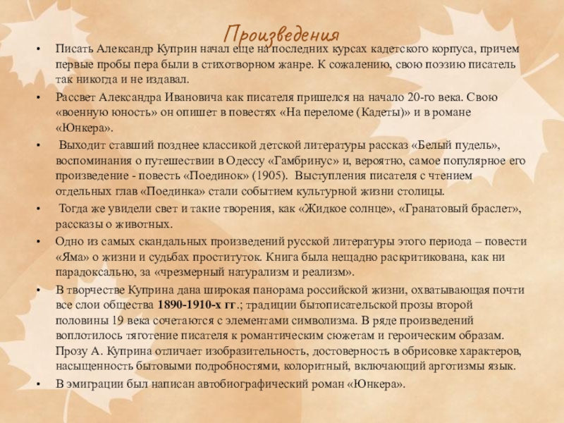 Выходит ставший позднее классикой детской литературы рассказ «Белый пудель», воспоминания о путешествии в Одессу «Гамбринус» и, вероятно, самое популярное его произведение - повесть «Поединок» (1905). Выступления писателя с чтением отдельных глав «Поединка» стали событием культурной жизни столицы.