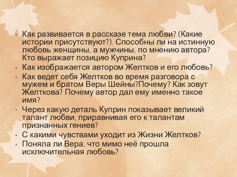Слайд 11Как развивается в рассказе тема любви? (Какие истории присутствуют?). Способны ли