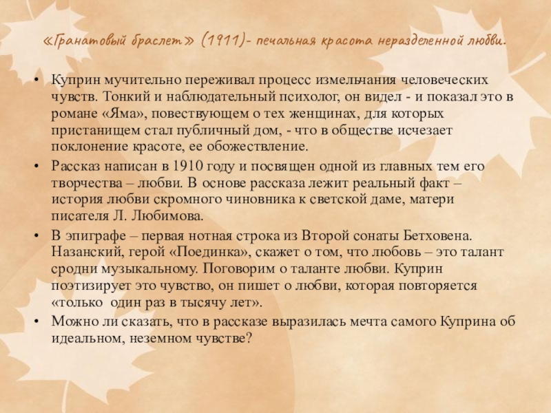 В эпиграфе – первая нотная строка из Второй сонаты Бетховена. Назанский, герой «Поединка», скажет о том, что любовь – это талант сродни музыкальному. Поговорим о таланте любви. Куприн поэтизирует это чувство, он пишет о любви, которая повторяется «только один раз в тысячу лет».