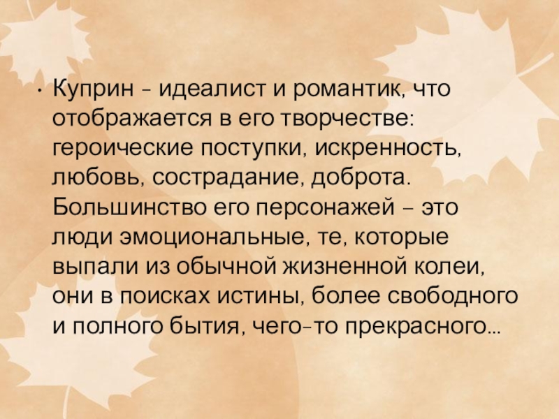 Слайд 7Куприн - идеалист и романтик, что отображается в его творчестве: героические