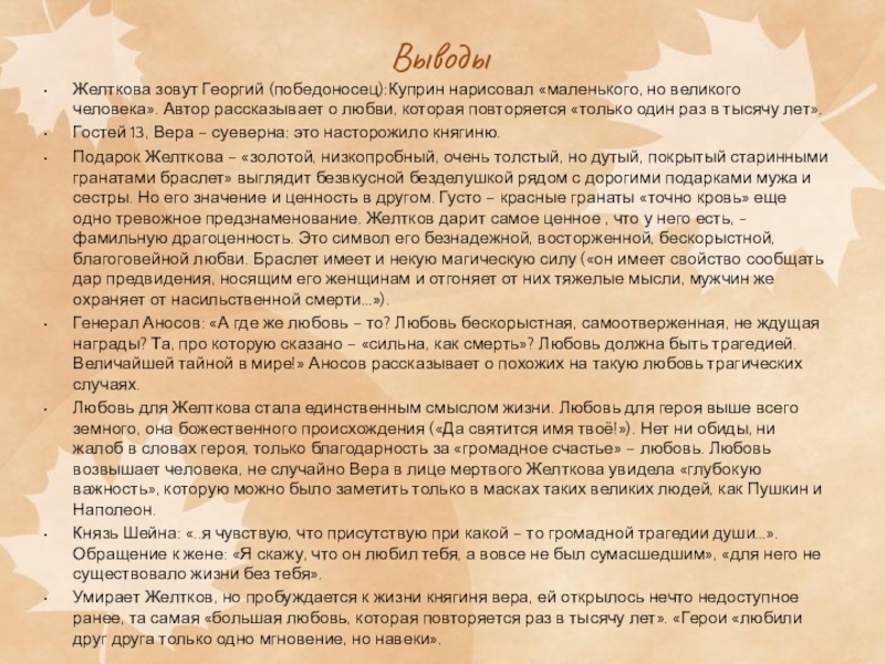 Любовь для Желткова стала единственным смыслом жизни. Любовь для героя выше всего земного, она божественного происхождения («Да святится имя твоё!»). Нет ни обиды, ни жалоб в словах героя, только благодарность за «громадное счастье» – любовь. Любовь возвышает человека, не случайно Вера в лице мертвого Желткова увидела «глубокую важность», которую можно было заметить только в масках таких великих людей, как Пушкин и Наполеон.