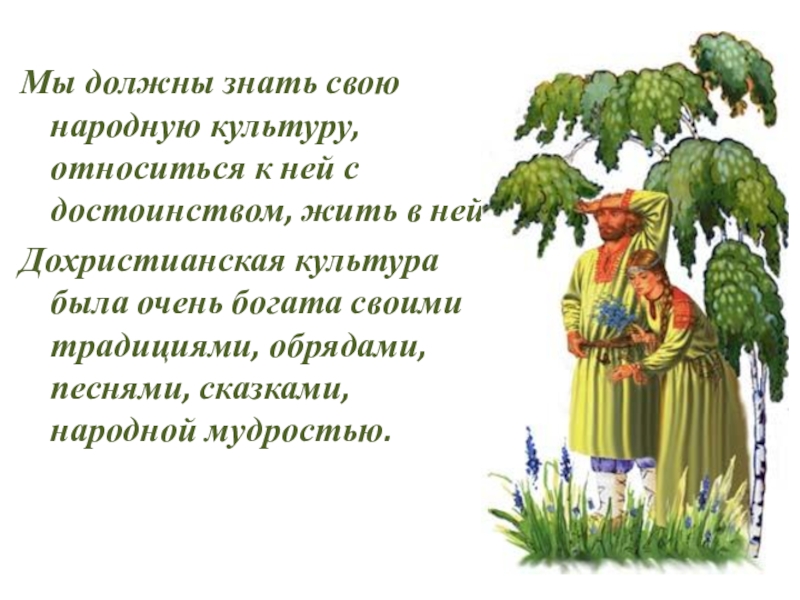 Слайд 22Мы должны знать свою народную культуру, относиться к ней с достоинством,