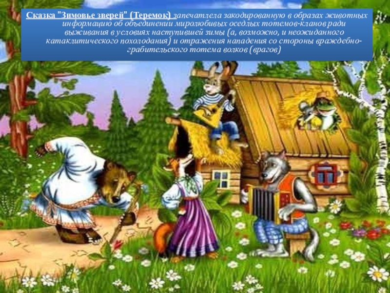 Слайд 17Сказка "Зимовье зверей" (Теремок) запечатлела закодированную в образах животных информацию об