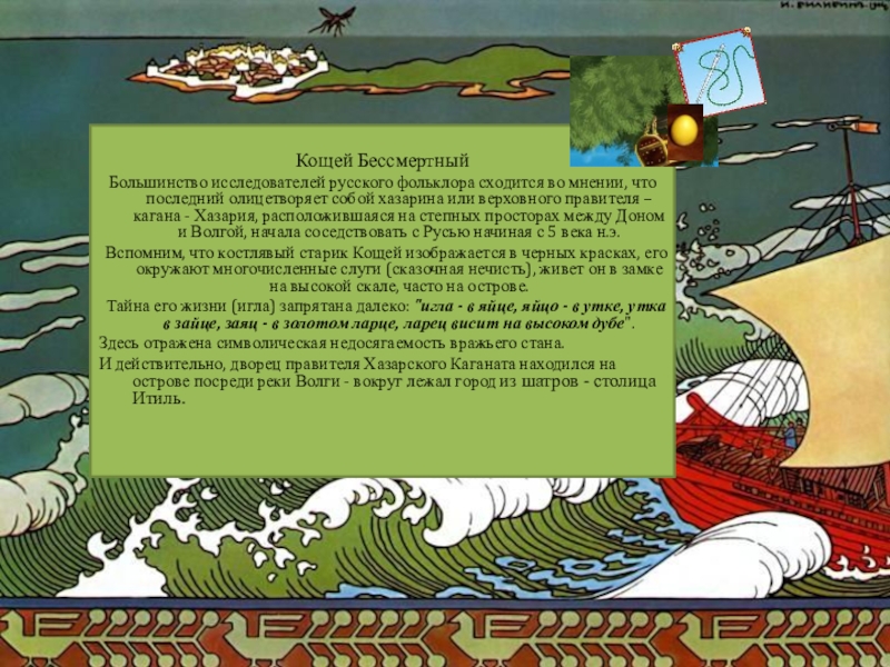 Вспомним, что костлявый старик Кощей изображается в черных красках, его окружают многочисленные слуги (сказочная нечисть), живет он в замке на высокой скале, часто на острове.