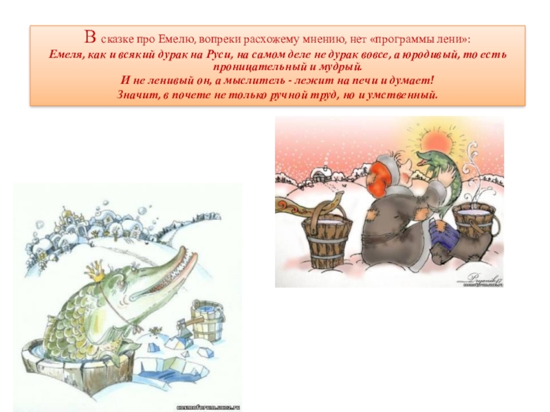 Слайд 19В сказке про Емелю, вопреки расхожему мнению, нет «программы лени»: