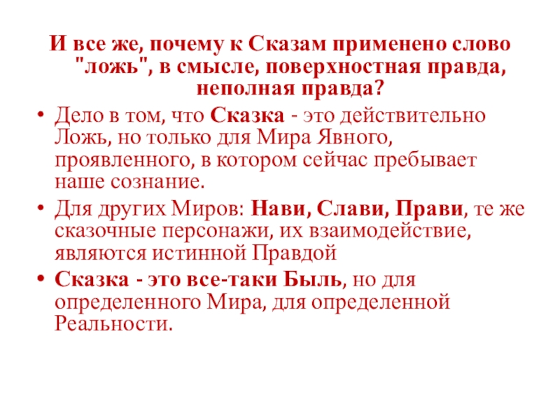 Для других Миров: Нави, Слави, Прави, те же сказочные персонажи, их взаимодействие, являются истинной Правдой