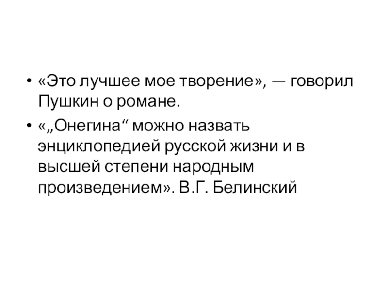 «Это лучшее мое творение», — говорил Пушкин о романе.«„Онегина“ можно назвать энциклопедией русской жизни и в высшей