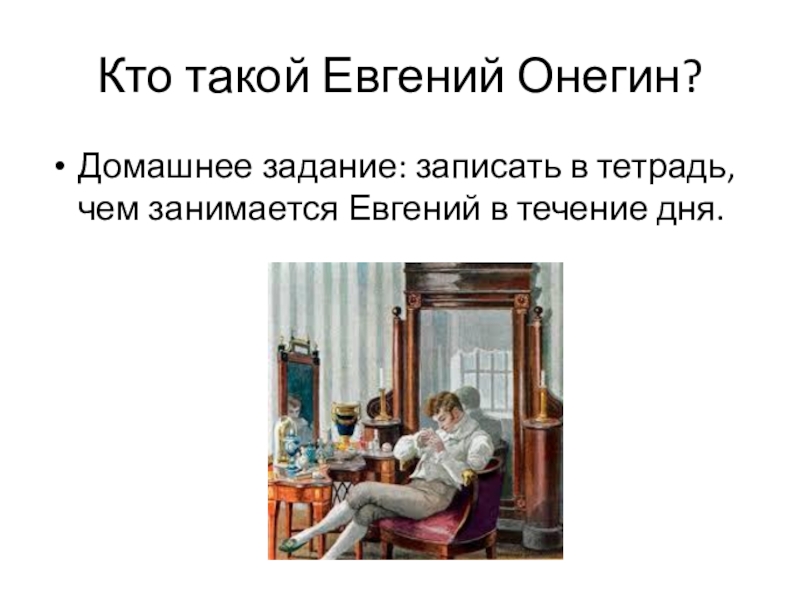 Кто такой Евгений Онегин?Домашнее задание: записать в тетрадь, чем занимается Евгений в течение дня.