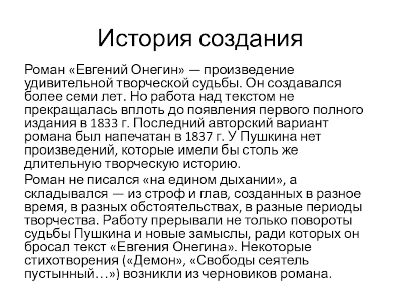 Роман не писался «на едином дыхании», а складывался — из строф и глав, созданных в разное время, в разных обстоятельствах, в разные периоды творчества. Работу прерывали не только повороты судьбы Пушкина и новые замыслы, ради которых он бросал текст «Евгения Онегина». Некоторые стихотворения («Демон», «Свободы сеятель пустынный…») возникли из черновиков романа.
