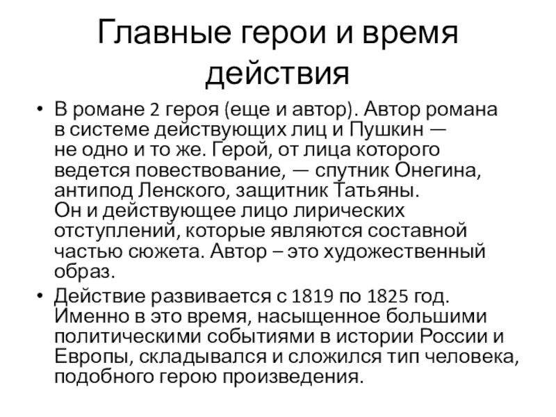 Главные герои и время действияВ романе 2 героя (еще и автор). Автор романа в системе действующих лиц и Пушкин — не одно