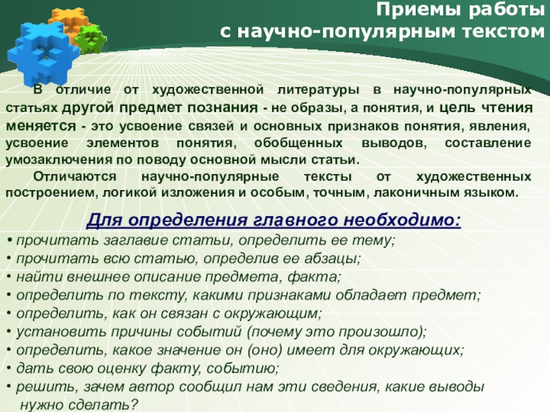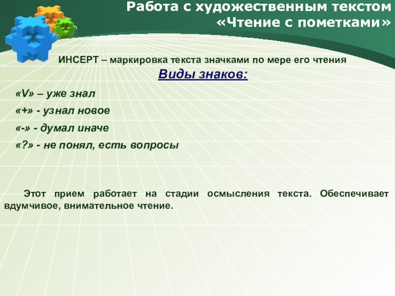 Этот прием работает на стадии осмысления текста. Обеспечивает вдумчивое, внимательное чтение.