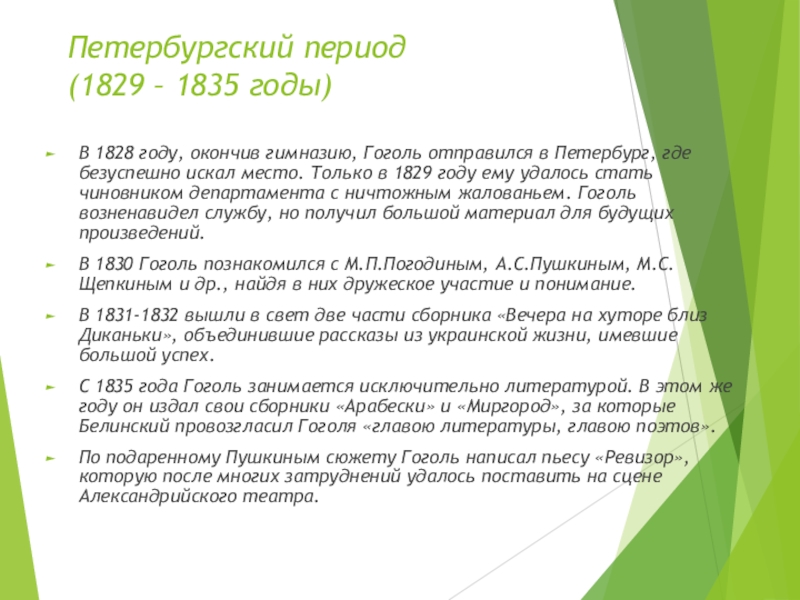 отправился в Петербург, где безуспешно искал место. Только в 1829 году ему удалось стать чиновником департамента с ничтожным жалованьем. Гоголь возненавидел службу, но получил большой материал для будущих произведений.