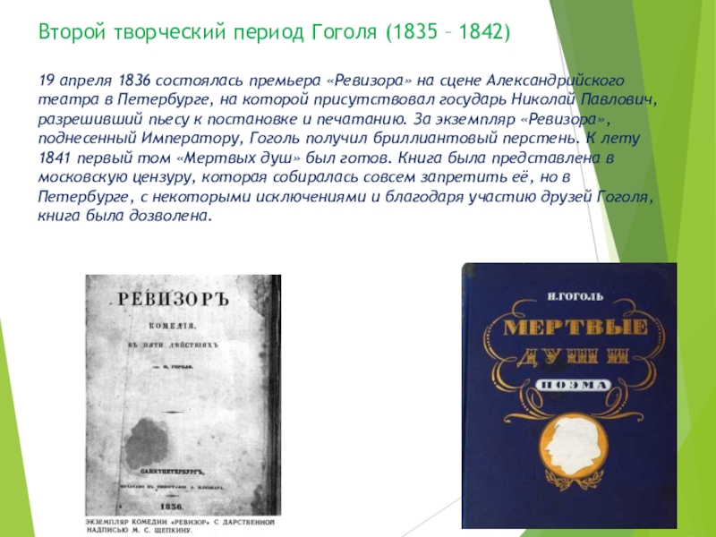 «Ревизора» на сцене Александрийского театра в Петербурге, на которой присутствовал государь Николай Павлович, разрешивший пьесу к постановке и печатанию. За экземпляр «Ревизора», поднесенный Императору, Гоголь получил бриллиантовый перстень. К лету 1841 первый том «Мертвых душ» был готов. Книга была представлена в московскую цензуру, которая собиралась совсем запретить её, но в Петербурге, с некоторыми исключениями и благодаря участию друзей Гоголя, книга была дозволена.