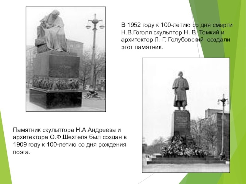 В 1952 году к 100-летию со дня смерти Н.В.Гоголя скульптор Н. В. Томкий и архитектор Л. Г. Голубовский создали этот памятник.