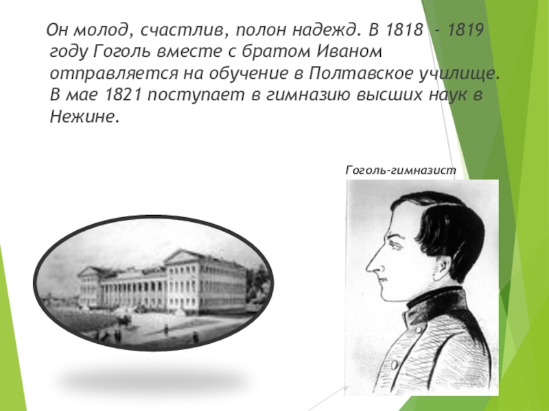 году Гоголь вместе с братом Иваном отправляется на обучение в Полтавское училище. В мае 1821 поступает в гимназию высших наук в Нежине.