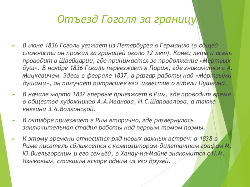 Германию (в общей сложности он прожил за границей около 12 лет). Конец лета и осень проводит в Щвейцарии, где принимается за продолжение «Мертвых душ». В ноябре 1836 Гоголь переезжает в Париж, где знакомится с А.Мицкевичем. Здесь в феврале 1837, в разгар работы над «Мертвыми душами», он получает потрясшее его известие о гибели Пушкина.