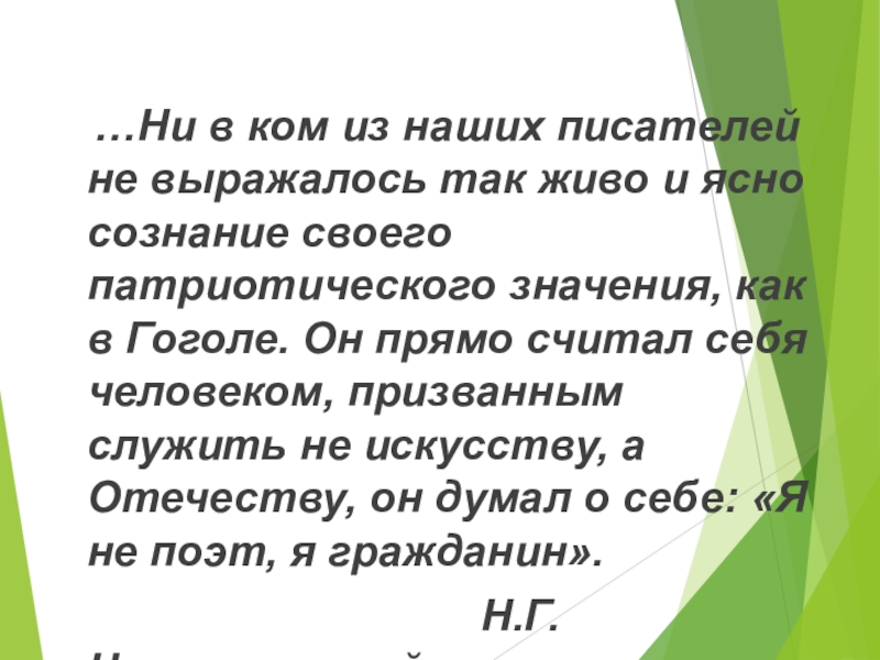 живо и ясно сознание своего патриотического значения, как в Гоголе. Он прямо считал себя человеком, призванным служить не искусству, а Отечеству, он думал о себе: «Я не поэт, я гражданин».