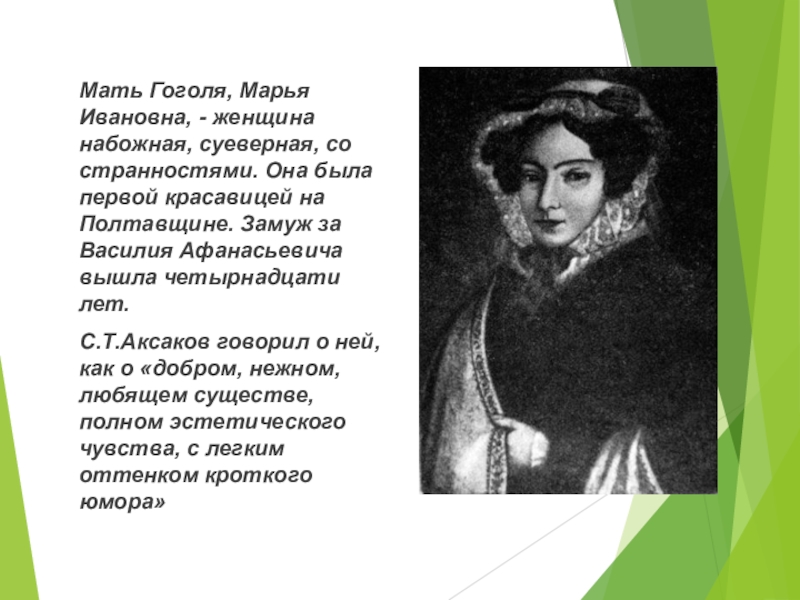 Слайд 6 Мать Гоголя, Марья Ивановна, - женщина набожная, суеверная,