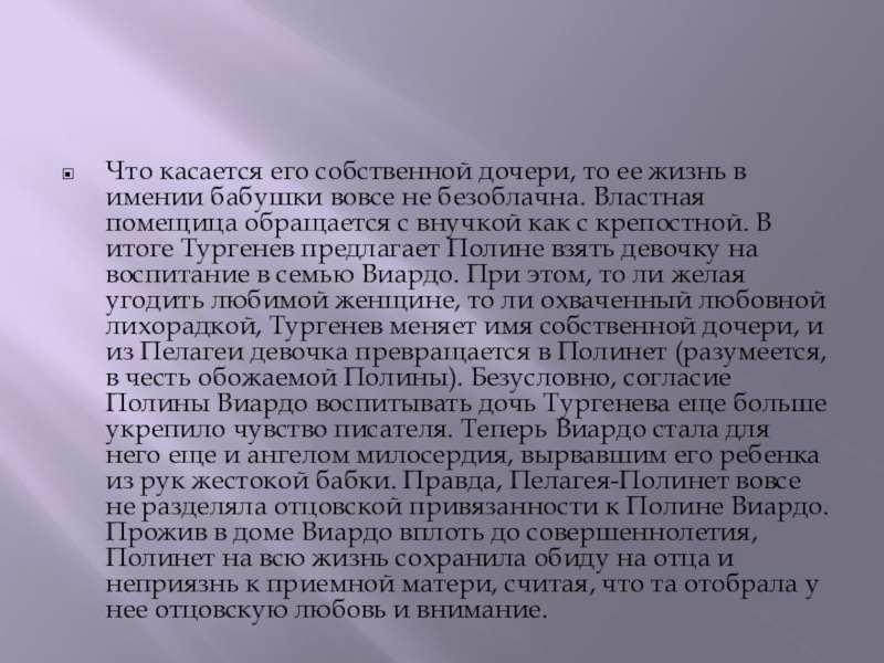 вовсе не безоблачна. Властная помещица обращается с внучкой как с крепостной. В итоге Тургенев предлагает Полине взять девочку на воспитание в семью Виардо. При этом, то ли желая угодить любимой женщине, то ли охваченный любовной лихорадкой, Тургенев меняет имя собственной дочери, и из Пелагеи девочка превращается в Полинет (разумеется, в честь обожаемой Полины). Безусловно, согласие Полины Виардо воспитывать дочь Тургенева еще больше укрепило чувство писателя. Теперь Виардо стала для него еще и ангелом милосердия, вырвавшим его ребенка из рук жестокой бабки. Правда, Пелагея-Полинет вовсе не разделяла отцовской привязанности к Полине Виардо. Прожив в доме Виардо вплоть до совершеннолетия, Полинет на всю жизнь сохранила обиду на отца и неприязнь к приемной матери, считая, что та отобрала у нее отцовскую любовь и внимание.