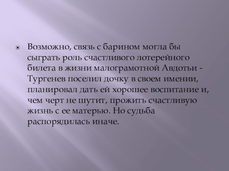 Слайд 11Возможно, связь с барином могла бы сыграть роль счастливого лотерейного билета