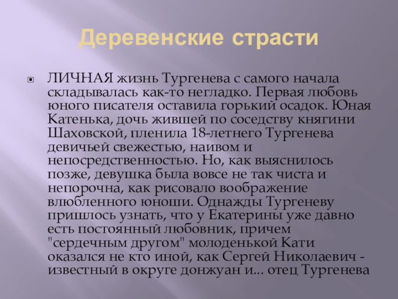 любовь юного писателя оставила горький осадок. Юная Катенька, дочь жившей по соседству княгини Шаховской, пленила 18-летнего Тургенева девичьей свежестью, наивом и непосредственностью. Но, как выяснилось позже, девушка была вовсе не так чиста и непорочна, как рисовало воображение влюбленного юноши. Однажды Тургеневу пришлось узнать, что у Екатерины уже давно есть постоянный любовник, причем "сердечным другом" молоденькой Кати оказался не кто иной, как Сергей Николаевич - известный в округе донжуан и... отец Тургенева